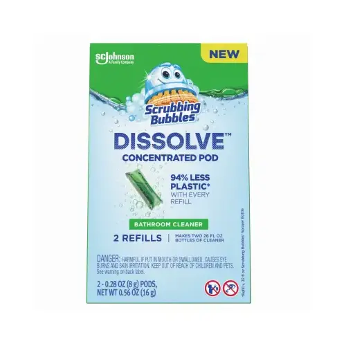 The future of cleaning means using less plastic, and the future is already here with Scrubbing Bubbles Dissolve concentrated pod bathroom cleaner. From the brand you love, this new and easy way to power through soap scum and grime saves 94% plastic with every refill. Scrubbing Bubbles Dissolve refill pack contains two concentrated pods. Every pod refill helps reduce plastic waste by 94%. Plus, it's easy to use. Just drop a pod into the starter pack empty bottle, fill bottle up to the shoulder with warm water, twist on the sprayer, and shake until the pod dissolves. Discover the power of less and choose dissolvable, not disposable. Scrubbing Bubbles Dissolve concentrated pod bathroom cleaner packs all the cleaning power you need in one full 26 oz bottle of Scrubbing Bubbles bathroom cleaner tackling stains, removing dirt and grime, leaving your surfaces squeaky clean. It's ideal for multiple hard, non-porous bathroom surfaces, such as tubs, showers, sinks, glazed ceramic tiles, stainless steel, chrome fixtures, glazed porcelain and more. Refilling your Scrubbing Bubbles Dissolve concentrated pod bathroom cleaner is a small act that helps you reduce plastic waste. The future of cleaning is here. Little pod, big impact.