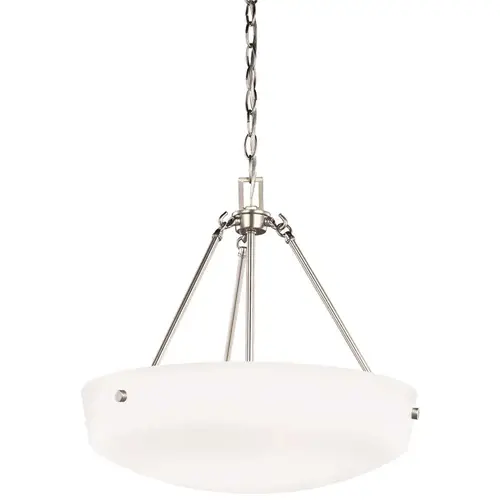 The Sea Gull Lighting Kerrville 3-Light indoor pendant in brushed nickel provides abundant light to your home, while adding style and interest. With a simple, airy appearance, the Kerrville lighting collection by Sea Gull Lighting embraces its modern design roots while enhancing virtually any home™s decor. Tubular steel arms extend outward and curve to present beautiful tapered, Satin Etched glass shades. The collection has a Brushed Nickel or Burnt Sienna finish and offers 3- and 5-light chandeliers, a 1-light mini pendant, one- and 3-light Pendant, a 2-light semi-flush mount which can convert to a pendant, and 1-, 2-, 3- and 4-light bath fixtures. Incandescent and ENERGY STAR-qualified fluorescent lamping are available.