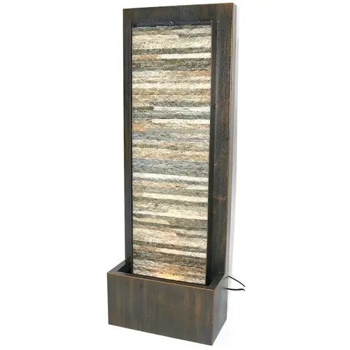 Enjoy the elegance of this stone monolith fountain. This is ideal to welcome your guests at the front door, or to create a peaceful presence in the back yard. The water cascades the length of the multi-toned ceramic brick wall, concluding in the lit basin below. The wall is surrounded by a steel frame and basin with a powder coated brown finish. This outdoor fountain is simple to use “ just adjust the pump in the basin through a door in the back of the reservoir, fill with water and plug it in. The rewarding relaxation from spending time with a calming fountain will help melt the stress of the week away.