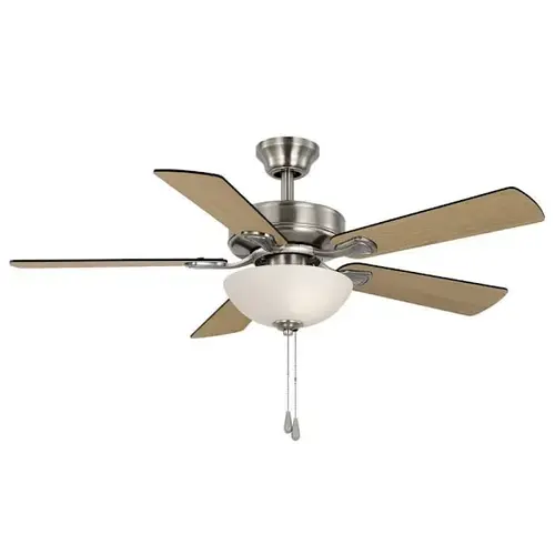 Seasons Tarisa 44" LED Ceiling Fan, Indoor, Brushed Nickel Use Location: Indoor Motor Type / Motor Speeds: AC Motor / 3 Speeds Downrod Included: Yes-4.5in Downrod Blade Finishes: Maple/Walnut Light Kit Included: Yes Number of Bulbs Required: 2 Bulb Shape Recommended: A19 Bulb Base Type Required: Medium (E26) Bulb Included: Yes Included Bulb Lumens: 800 Light Shade Material: Plastic Dimmable: No Control Type: Pull Chains Mfg #32552