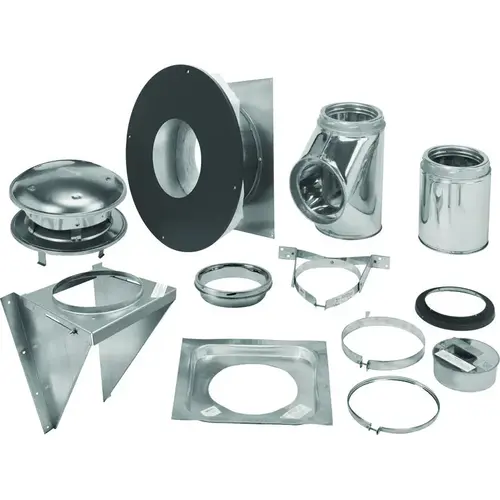 Includes: (1) Round Top (1) Wall Band (1) Insulated Tee (1) Wall Support Kit (1) Insulated Wall Thimble (1) 12 in Pipe Section (1) Smoke Pipe Adapter and (1) Finish Collar