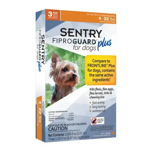 SENTRY Fiproguard Plus kills fleas, flea eggs, flea larvae, ticks and chewing lice. The fast-acting, long-lasting squeeze-on is formulated to protect your dog against dangerous pests. It breaks the flea life cycle by killing flea eggs and larvae and kills ticks that may transmit Lyme disease. SENTRY Fiproguard Plus is just as effective against fleas and ticks as FRONTLINE Plus.