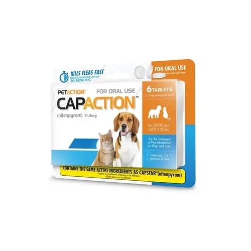 PetArmor CapAction Fast-Acting Oral Flea Treatment for Small Dogs (2-25 lbs), 6 Doses, 11.4 mg Get fast flea relief for your small to medium-size dog with PetArmor CapAction (nitenpyram). It contains the same ingredients as CAPSTAR (nitenpyram) and starts killing adult fleas within 30 minutes with no messy applications. One easy-to-use tablet of PetArmor CapAction for small to medium-size dogs works from the inside out and achieves greater than 90% effectiveness against adult fleas on your dog within four hours. This affordable over-the-counter oral flea tablet is intended for dogs 4 weeks of age and older and weighing 2 to 25 pounds. PetArmor CapAction oral flea tablets are safe for pregnant or breeding dogs. When you need fleas gone fast, use PetArmor CapAction.
