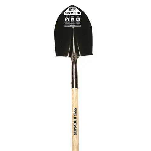 16 gauge steel round point head. Rolled edge step. 42 in. contoured hardwood handle with clear lacquer finish. Durable steel and wood construction. The Seymour S200 56 in. Round Point Shovel is a farm, home or jobsite essential that's designed to be effective and durable. The sturdy blade is crafted from durable steel and securely riveted to the tough wooden handle for maximum performance and reliability.