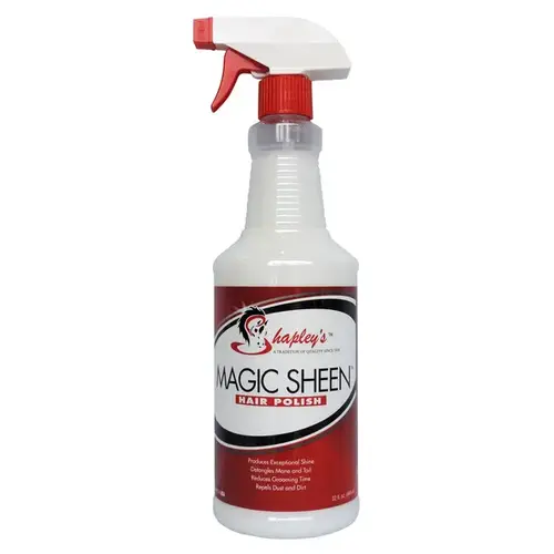 Shapley's Magic Sheen is an oil-free and alcohol-free polish. A unique blend of silicone and water that produces exceptional shine and a lustrous, healthy coat, mane and tail. Formulated to coat the hair, it helps detangle mane and tail and repels dirt & stains. Reduces grooming time. Spray magic sheen on clean coat, mane and tail. Apply to wet coat for maximum shine and follow up misting on dry coat for added condition and shine.