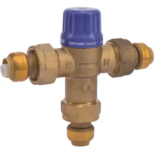 The SharkBite Heat guard 110-D is a Temperature Actuated Mixing Valve that mixes hot water with cold to deliver tempered water at a controlled temperature to 120°F maximum. The Heat guard 110-D is designed to assist in the prevention of scalding. The SharkBite Heat guard 110-D valve delivers water at a maximum of 120°F, allowing the heater to be set at 140°F or higher, thus providing a greater effective volume of hot water.