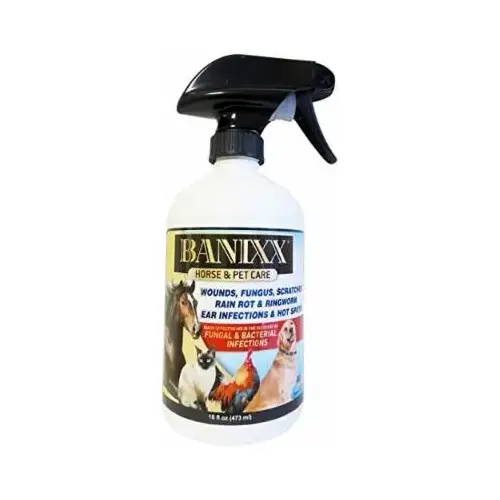 Banixx Wound & Hoof Care Spray treats infections such as rainrot, ringworm, fungus, scratches, mudfever, thrush, and whiteline.