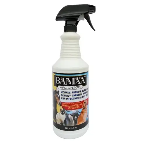 Banixx Wound & Hoof Care Spray treats infections such as rainrot, ringworm, fungus, scratches, mudfever, thrush, and whiteline.