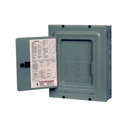 Code-gauge steel enclosure. Single phase, 3-wire, solid neutral, 8 spaces and 16 circuits maximum 1-pole, 4 QP breakers maximum 2-pole, 120/240 V. 10,000 AIR. One piece plated aluminum bus bar. 100% circuit breaker twist outs. Positive load side circuit breaker hook rail. Suitable for use as service entrance equipment when a main breaker (125 A maximum) is back-fed in branch position and used with main breaker retainer clip No MBR1. When used as service equipment, any unused neutral position may be used for equipment grounding. Rotate entire device 180 deg for bottom feed. Gray enamel finish. 12-3/8 in x 14-3/4 in x 3-7/8 in. UL listed, complies fully with NEC and UL requirements for Class CTL.