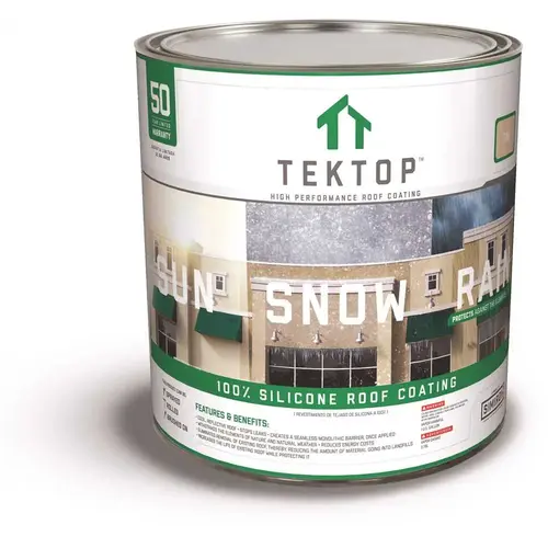 TekTop 100% Silicone High Solids Roof Coating is a solvent-free coating created to permanently shield and repair existing roofs against leaks, ponding water and other damaging weather by forming a durable, seamless membrane in just 1 coat. TekTop 100% silicone coating offers UV resistance using a highly reflective coating to help keep building cool. Apply on flat or low-sloped roofs to strengthen and extend the life of your roof surfaces. Great for low sloped roofs, mobile homes, RVs, storage units, campers, trailers and more.