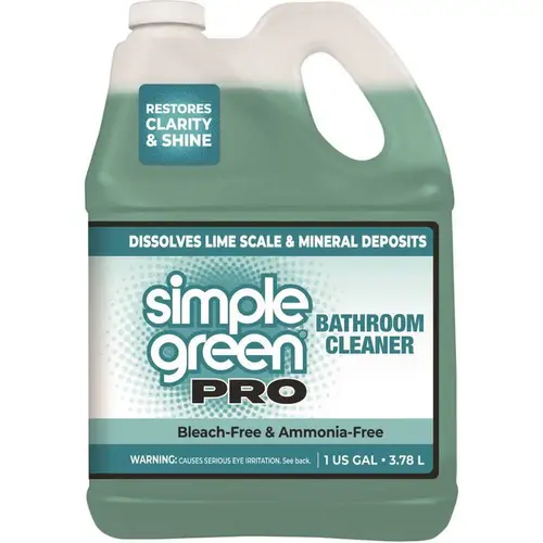 Simple Green Pro Bathroom Cleaner 1 Gallon Concentrated Bathroom Cleaner For Use On All Washable Bathroom Surfaces Effectively removes dirt, lime scale, mineral deposits, hard water stains, soap scum, light rust, and oxidation Ideal for use on porcelain, tile, glass, ceramic, stainless steel, chrome, aluminum, copper, and more Cleans sinks, tubs, toilets, showers, faucets, fixtures, drains, and more Bleach-free, ammonia-free, and phosphate-free Deodorizes as it cleans with a fresh wintergreen scent Economical concentrate can be diluted to save money Effectively removes build-up, restores clarity and leaves behind a streak-free shine Works great on drains and pipes including ABS, PVC, copper, and more Non-abrasive and non-flammable VOC compliant, non-fuming formula Mfg #1710100451128
