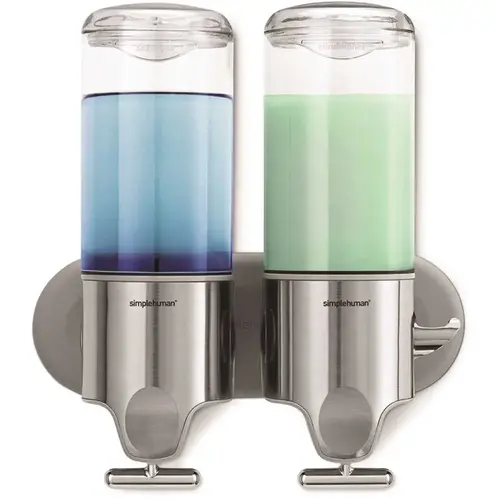 SIMPLEHUMAN Double Wall Mount Shower Pump 2x15 fl.oz Shampoo/Soap Dispensers SS More Suds, Less Clutter - Simplehuman's Wall-Mounted Pump Eliminate Bottle Clutter And Keep Everything You Need Within Easy Reach I'M ERGONOMIC - The durable die-cast t-bar lever makes it easy to dispense just the right amount of soap, shampoo or conditioner. NO MESSY SPILLS - Wide opening makes refills fast, easy, and spill-free. EASY TO CLEAN - Dispenser lifts off wall plate for easy cleaning or refill. CONVENIENT STORAGE HOOKS - Hold a razor, loofah, or other accessories. EASY TO INSTALL - Installs easily with double-sided tape. RUST-PROOF MATERIALS - Durable, long-lasting materials won't rust or discolor. Mfg #BT1028