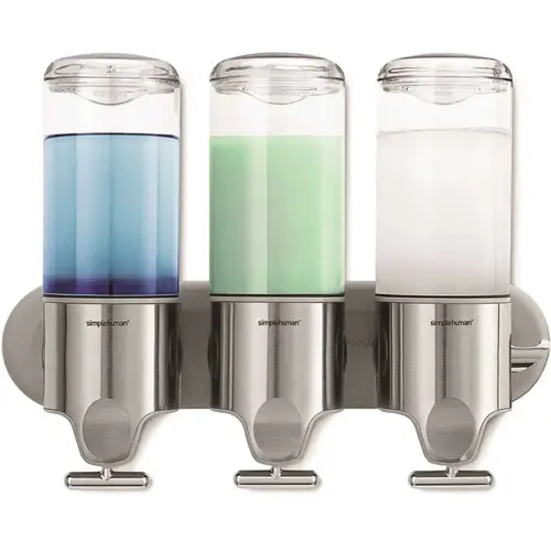 SIMPLEHUMAN Triple Wall Mount Shower Pump 3x15 fl.oz Shampoo/Soap Dispensers SS More Suds, Less Clutter - Simplehuman's Wall Mount Pumps Eliminate Bottle Clutter And Keep Everything You Need Within Easy Reach. I'M ERGONOMIC - Our durable die-cast t-bar lever makes it easy to dispense just the right amount of soap, shampoo or conditioner. NO MESSY SPILLS - Wide opening makes refills fast, easy, and spill-free. EASY TO CLEAN - Dispenser lifts off wall plate for easy cleaning or refill. ONVENIENT STORAGE HOOKS - Hold a razor, loofah, or other accessories. EASY TO INSTALL - Installs easily with double-sided tape. RUST-PROOF MATERIALS - Durable, long-lasting materials won't rust or discolor. Mfg #BT1029