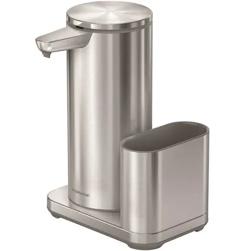 SIMPLEHUMAN Touch-Free Recharge Senr Liq Soap/Dishwash Disp Sponge Caddy 14oz SS Perfect Tool For Dispensing Soap Touch-Free Without Leaving Germs Behind hassle-free dishwashing: Just hold out your sponge and the soap dispenses instantly and automatically. No fumbling with messy (and wasteful) dish soap bottles. give your pump and sponge a well-designed home with our stainless-steel sponge caddy. Keep the busy sink area clutter-free unique variable dispense feature allows you to control the dispense volume automatically ” put your hand up close for a small dab, or farther away for more. wide opening is designed for quick & easy drip-free refills. rechargeable - water-resistant wireless charging . fully enclosed charging environment to prevent water damage or corrosion. Mfg #ST1077