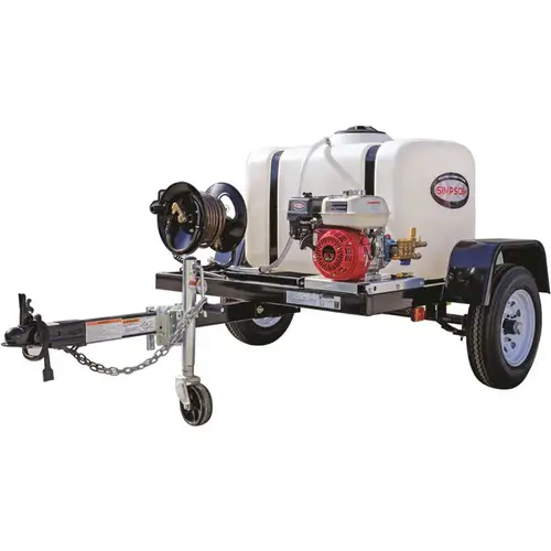 This Simpson Mobile Pressure Washing System helps you effectively clean on commercial projects. It features a high-performance Honda GX2000 engine with a dot-certified trailer and over-the-road system. The steel-braided, high-pressure hose is powerful, ideal for resorts, mobile detailers, contract cleaners and more. It's also easy to set-up.