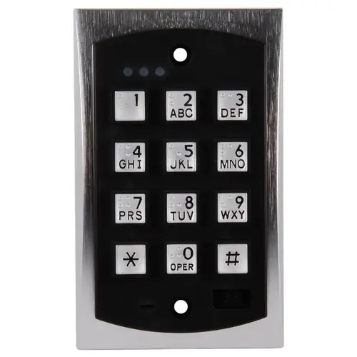 EM Style Flush-Mount Durable Metal Access Control Keypad, 500 Users, Single Gang Flush Mount Design, Metal Braille Alpha-Numeric Keys, Key Press Feedback via Sounder and Yellow LED, Indoor/Outdoor use, Keypad Programmable, Built-in Assignable Sounder, Bi-color Red/Green LED Indicates Relay Status, Satin Stainless Steel