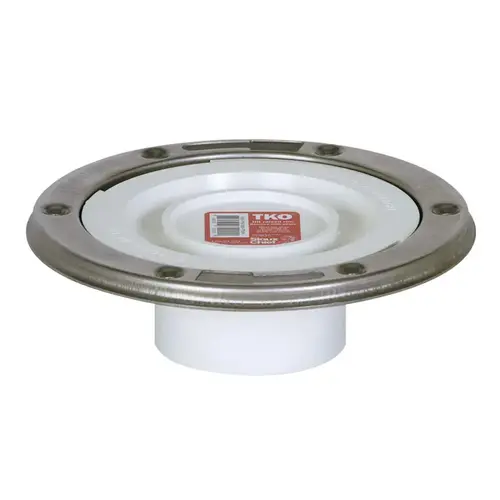 This TKO 3 inch inside, flush to floor PVC total knockout closet flange offers easier installation, and there's no need to hold knockout while hammering. Strong, corrosion-resistant stainless steel ring eliminates cracked flanges.
