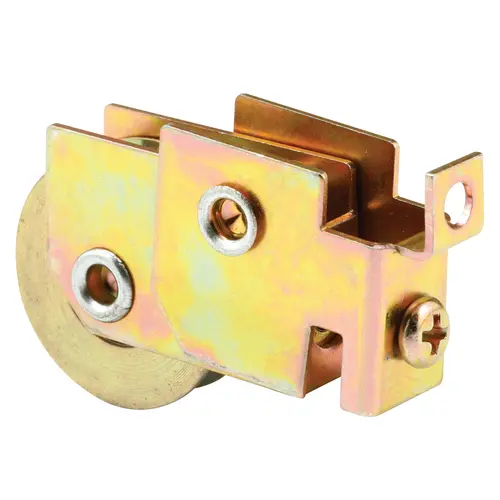 Prime-Line Roller Assembly, Number of Rollers: 1, Bearing Type: Ball, Roller Edge Type: Concave, Roller Width: 5/16 in, Roller Diameter: 1-1/4 in, Steel, Gold, F-Tab Mounting, Dimensions: 1-5/16 in L x 9/16 in W x 1-1/8 in H, Suitable for: Sliding Patio Glass Doors