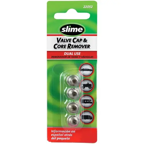 Replace your standard tire valve caps with caps that do double duty. A tire valve cap and core removal tool in one, each package contains four dual-purpose metal units.