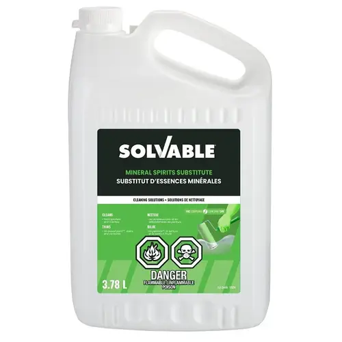 Solvable Mineral Spirit, Professional-Grade, Liquid, Clear Yellow, Odor/Scent: Hydrocarbon, Net Content: 3.78 L, Compositions: Stoddard Solvent, n-Nonane, 1,2,4-Trimethylbenzene, Naphthalene, Xylene (Mixed Isomers), Ethylbenzene, Viscosity: 1.21 cSt, Flash Point: 109 deg F, Boiling Point: 318 to 383 deg F, Specific Gravity: 0.788