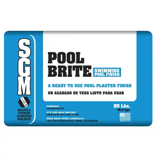 SGM Pool Brite Blended (PCB305) is a pre-mixed pool finish combining crushed marble, white cement, and proprietary additives for a brilliant white surface. This 80-pound bag covers 22-25 sq. ft. at 3/8" to 1/2" thickness, ideal for new or renovated pools, offering durability and a smooth, radiant finish.Specs: 80 lb bag; 22-25 sq. ft. coverage at 3/8"-1/2" thick; meets ASTM standards.Compatible with concrete pool interiors; suits residential or commercial applications.Installation: Mix with 2-2.5 gal water, trowel over prepared surface; tools: mixer, trowel.Features: High-strength marble finish; resists etching, enhances pool aesthetics.