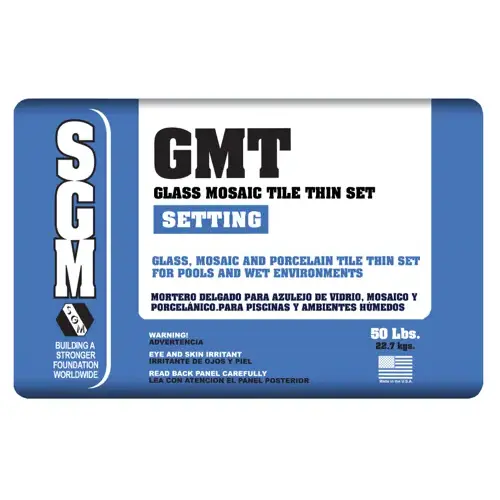 SGM Glass Mosaic Tile (GMT) Thin Set (SGM-GMT) is a 50 lb bag of polymer-fortified, latex-Portland cement mortar designed for superior adhesion of glass, mosaic, porcelain, ceramic, and natural stone tiles in wet environments. Ideal for pool, spa, and water feature installations, its ultra-white finish enhances translucent tiles, offering easy mixing and application.Specs: 50 lb bag; covers 60-75 sq. ft. at 1/4" thick; meets ANSI A118.4, A118.11 standards; mix with ~1.5 gal water.Compatible with glass, mosaic, porcelain, ceramic tiles; suits submerged applications, radiant heating systems.Installation: Mix with water (250-350 RPM drill), apply with notched trowel after 5-min slake; tools: drill, trowel; keep above 50 degreeF.Features: Non-slump ridges; stain-resistant; ultra-white finish enhances tile vibrancy, durability.