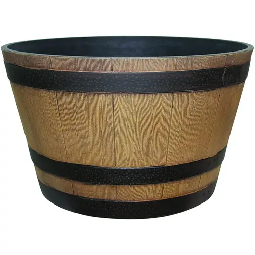 With a down-home, country-style feel, the resin whiskey barrel creates the perfect combination of elegance and simplicity to your outdoor or indoor living space. The heavy-duty plastic construction of this container also includes UV protectors that increase resistance to cracking and fading. Your vibrant-colored flower or vegetable arrangements will provide a pleasing pop of color in these faux-wood planters.