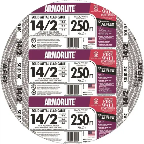 Southwire Armorlite Type MC Cable is constructed with soft-drawn copper, Type THHN/THWN conductors rated 90°C dry available in sizes 14 AWG through 2 AWG and a green insulated grounding conductor. The conductors are cabled together and a binder tape bearing the print legend is wrapped around the assembly. Aluminum interlocking armor is applied over the assembly.