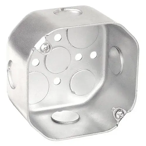Southwire Octagon Box, Number of Knockouts: 7, Cable Entry: Knockout, Cubic Capacity: 20 cu-in, Housing Material: Steel, Galvanized, Silver, 4 in OAW, Overall Depth: 2-1/8 in, Includes: Mounting Screws