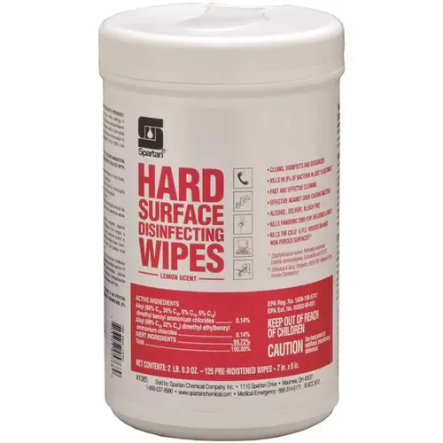 Spartan Hard Surface Disinfecting Wipes are formulated to disinfect hard, non-porous, inanimate environmental surfaces. Convenient and ready to use, Spartans Hard Surface Disinfecting Wipes can be utilized in any environment where bacteria and disease spread. Kills 99.9% of bacteria in just 15-seconds.