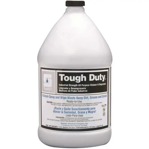 Tough Duty is a butyl-based, ready-to-use cleaner and degreaser formulated and packaged for maximum user convenience. A non-viscous clear pink liquid, Tough Duty is an industrial strength all-purpose cleaner with a combination of wetting and cleaning agents fortified with a solvent giving it the ability to quickly penetrate and remove both food and industrial type grease-base soils.