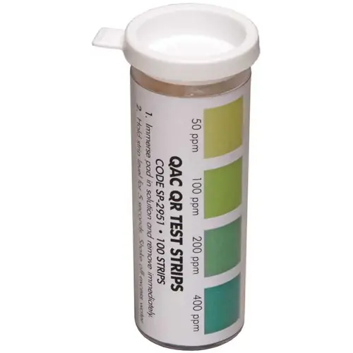 Tests in-use parts per million of quaternary disinfectants. Range equals to 50 PPM - 400 PPM. 50 test strips.
