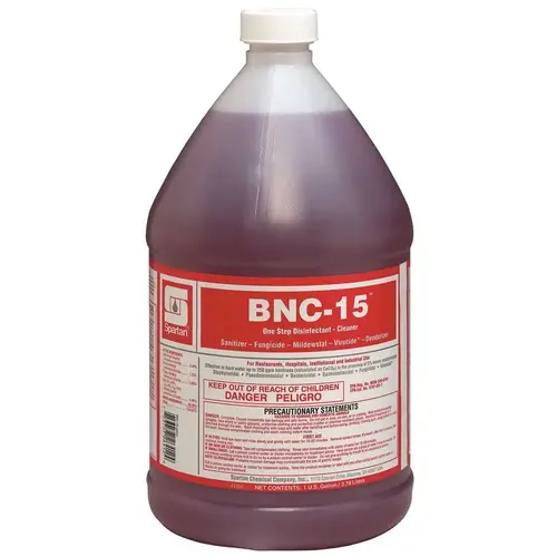 BNC-15 delivers non-acid disinfectant and cleaning performance in an economical concentrate. BNC-15 is a proven 1-step disinfectant, cleaner, sanitizer, fungicide, mildew stat, virucide, which is effective in water up to 250 ppm hardness in the presence of 5% serum contamination. This product provides non-food contact sanitization in just 15-seconds.