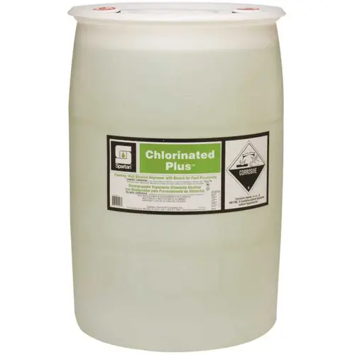 Chlorinated Plus is an ultra heavy-duty, strong alkaline, high foam, concentrated degreaser, fortified with bleach. Chlorinated Plus is formulated for heavily soiled food processing surfaces and equipment contaminated with animal fats and oils, blood stains, and other baked on carbonized soils. Chlorinated Plus may be used in meat, poultry, seafood, and other food processing industries.