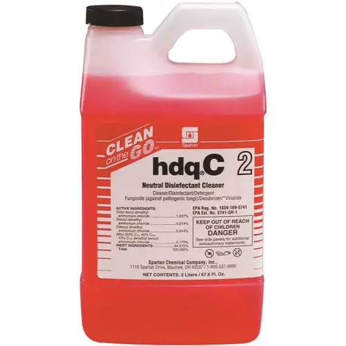 hdqC 2 is a neutral pH, quaternary disinfectant cleaner formulated to kill a broad spectrum of microorganisms on high gloss floors, and other hard, nonporous surfaces. It disinfects without damaging or dulling floor finish even with repeated use. hdqC 2 deodorizes hard-to-keep-fresh-smelling areas such as garbage storage areas, toilet bowls, and other areas which are prone to odors caused by microorganisms.