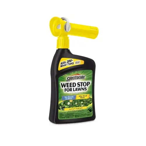 Spectracide Weed Stop For Lawns Concentrate2 kills all types of listed broadleaf weeds including dandelion, chickweed, clover and yellow nutsedge. This product treats bluegrass, fescue, zoysia, Bermuda and perennial ryegrass. For best results, apply between 45 deg and 90 deg. above 45 deg, the better the weeds will be able to absorb the product. Lawn damage could happen above 90 deg. This easy-to-use product is designed with the QuickFlip sprayer, allowing you to just connect your hose and spray at the flip of a switch. Spectracide Weed Stop For Lawns Concentrate2 kills by contact and kills weed roots. Controls 460+ weeds as listed, giving you visible results in 3 hr. When used as directed, this product kills the weeds, not the lawn.