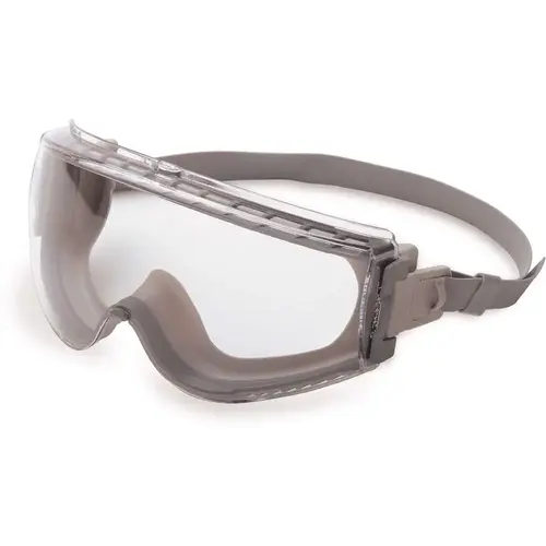 Stealth Safety Goggles with Clear Tint Uvextreme Lens, Gray and Gray Frame and Neoprene Band. Futuristic, low profile design for chemical splash and impact. Toric lens provides superior optics and peripheral vision. Quick adjust headband.