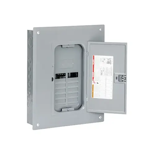 Main lug indoor load center. Convertible to a main breaker with a QOM1 main breaker. Single-phase load center, NEMA type 1 enclosure, combination flush/surface indoor cover. Overhead or underground feed options. Plated aluminum bus bar. UL listed.