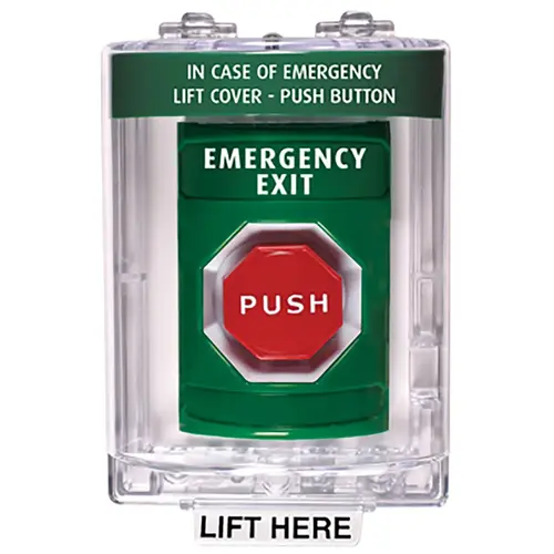 Stopper Station, Green, Flush Cover, Universal Stopper, Label Shell, Pneumatic, Illuminated, "EMERGENCY EXIT"English