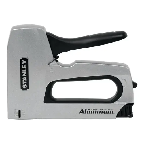 The Stanley SharpShooter heavy-duty staple gun delivers high-power and deep penetration with an easy squeeze handle, high-and low power lever for hard and soft materials and heavy-duty aircraft-aluminum housing. Anti-jamming mechanism. Easy-slide full-stick staple load.