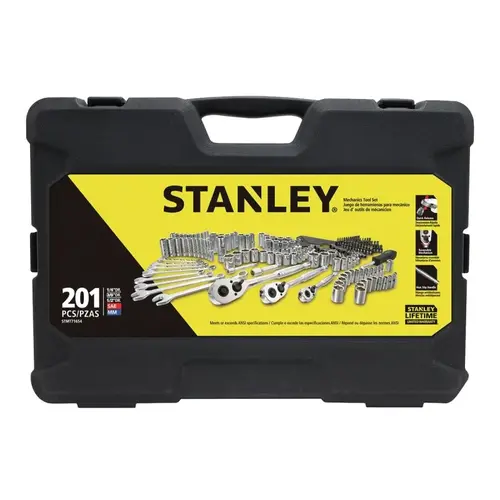 The Stanley 201-piece professional mechanics tool set is a complete tool set for mechanics that includes ratchets, extension bars, SAE and metric-sized sockets and nut bits, hex keys, combination wrenches and much more. Everything is housed in a rugged carry case.
