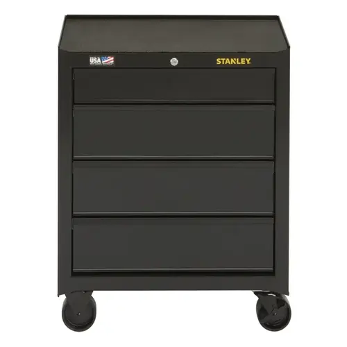 This 26 in wide four-drawer rolling tool cabinet is constructed of all-steel for strength and durability. It has four 50 lb load capacity, full-extension ball-bearing drawer slides and a keyed internal locking system to safeguard tools. Plus, the non-slip open weave top mat helps protect the cabinet surface. Its load rating is 500 pounds with four 4 x 2 in casters, two of which lock and swivel. Recommended with this unit is our 100 Series 26 in. W four-drawer tool chest (STST22643BK) and 100 Series 26 in W two-drawer middle tool chest (STST22621BK), sold separately. Look no further than our 100 Series metal tool storage line for your home garage tool storage and organization needs. Choose from a variety of sizes in top and middle tool chests, rolling tool cabinets and mobile workbenches, all made of 20 to 24 ga steel with black steel drawer trims.