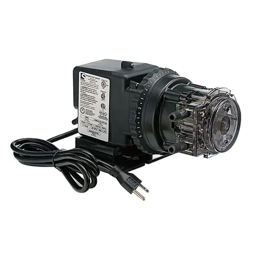 Stenner Chlorine Feeder 85M is designed for residential pools, featuring a peristaltic pump in a polycarbonate body with a fixed 5 GPD output and 1/4" tubing. Self-priming up to 100 PSI, it delivers precise chlorine dosing for pools up to 50,000 gallons, ensuring clear water with easy, tool-free maintenance.Compatible with 15% sodium hypochlorite, integrates with 1/4" PVC lines, per Stenner specs.Dimensions: 10" W x 6" H x 5" D; 5 GPD at 100 PSI; polycarbonate; 120V single-phase.Installation uses 1/4" fittings, suction strainer; tools: none; includes check valve, 20 tubing.Clients enjoy reliable sanitization and low-maintenance operation with a durable design.