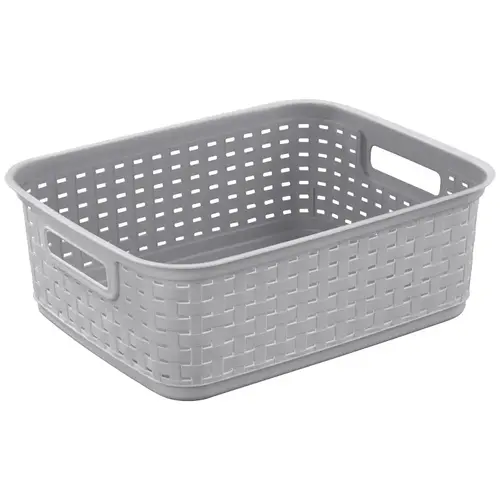 The short weave basket combines the decorative look of wicker with the convenience of easy-to-clean durable plastic. The weave pattern adds a fashionable touch to everyday storage, for items kept out in the open. Rectangular in shape, this basket is ideal for reducing clutter on counter tops, pantries, bookshelves, entertainment centers and more. When used with other storage baskets, this item can create a customized storage solution that fits any household need. A reinforced rim provides a great gripping location for lifting and transporting contents.
