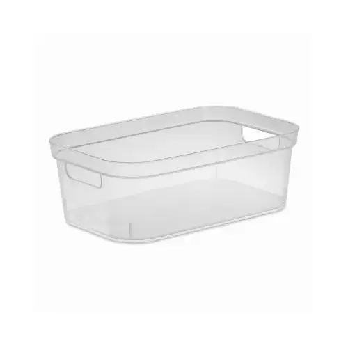 Storage bins are a multi-purpose storage solution with a simple and classic style. The versatility of these bins allows them to be used in any room of the home, the bedroom, bathroom, dorm room, office, classroom or playroom. Available in 4 convenient sizes, storage bins are ideal for closet organization, as they are specifically designed to fit on 16 in wire shelving. The small storage bin is ideal for storing anything from clothing and accessories to office supplies and hair and beauty products. The open design provides easy access for stored items and allows for quick clean-up, while the carry-through handles make for effortless and comfortable transport. The sturdy, banded rim adds a stylish touch to the bins, while the modern, clear design works well with any home decor. The bins feature polished sides and a textured bottom that are both easy to clean. The overall assembled dimensions of this item are 12-1/4 in L x 8 in W x 4-1/4 in H.