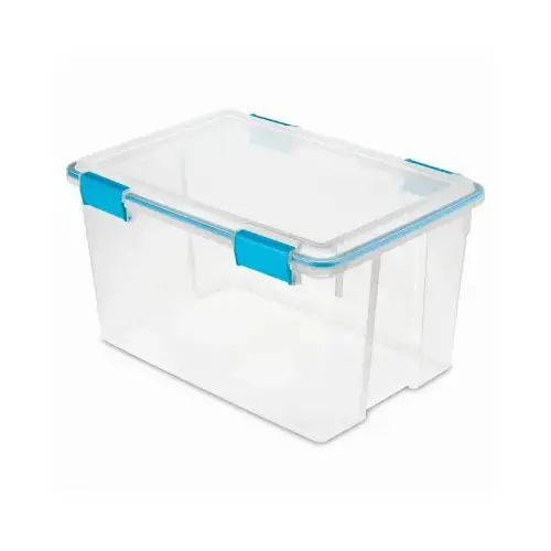 The 54 qt gasket box offers a gasketed seal to safeguard items from both air and moisture. Durable, tight-fitting latches help keep the lid securely to the base and the clear design allows contents to be easily identified. This storage box is ideal for the organization of school projects, paperwork and photographs that need to be protected. The gasketed seal also helps to keep pet food and other bulk foods fresh longer.