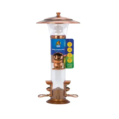 7L x 7W x 15.5H in. Constructed of plastic. Features copper and clear finish. Attracts variety of birds. Comes with adjustable perches.