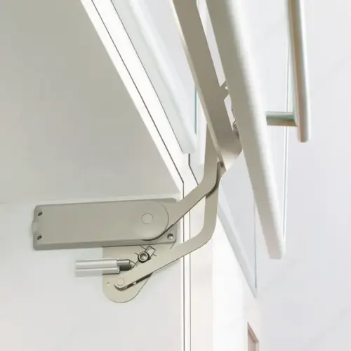 - Mechanism makes it easy to lift doors and holds them in the open position.