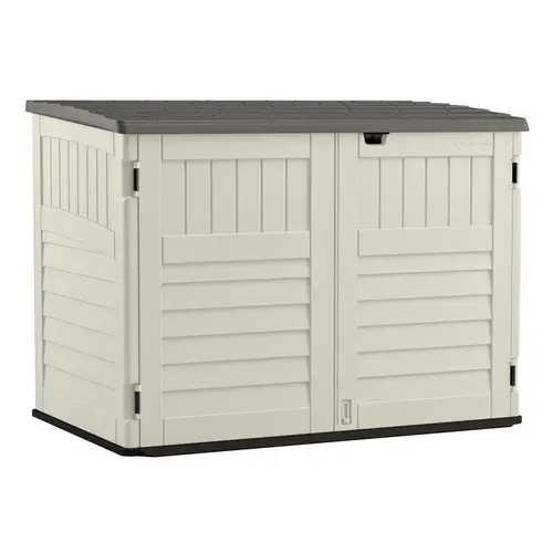 The Stow-Away horizontal shed is ideal for storing garbage cans and recycling bins as well as lawn and garden supplies, tools, smaller bicycles, patio cushions and more. The possibilities are limitless! The low-profile design is ideal for placement on the side of a house, on a patio or under a fence line. The lid features gas shocks for easy access while the durable design is constructed using steel-reinforced multi-wall resin. It also has a three-door locking mechanism which can be padlocked for added security.