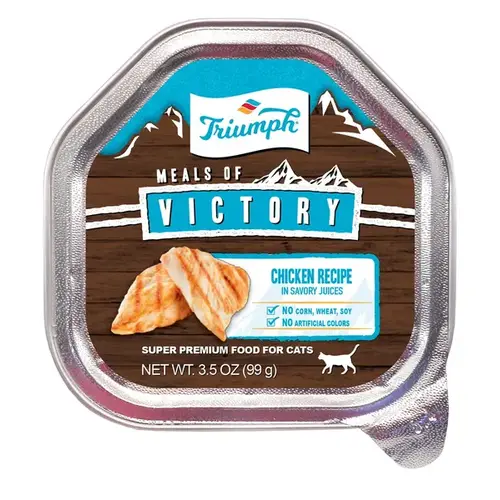 Triumph Meals of Victory Seafood Medley in Savory Juices Cat Food is made with select wholesome ingredients and slowly cooked to mouthwatering perfection. Great as a stand-alone meal for smaller furry friends, or a dry food topper that will get those paws begging for dinner time! Your best friend will love the taste, quality, and nutrition that comes with this classic craft of a meal. Guaranteed Analysis: Ingredients: DEBONED CHICKEN, WATER SUFFICIENT FOR PROCESSING, CHICKEN LIVER, POLLOCK, COD, CALCIUM CARBONATE, NATURAL FLAVOR, POWDERED CELLULOSE, LOCUST BEAN GUM, CARRAGEENAN, SODIUM TRIPOLYPHOSPHATE, CANOLA OIL, VITAMIN E SUPPLEMENT, SALT, MAGNESIUM CARBONATE, ASCORBIC ACID, ZINC SULFATE, XANTHAN GUM, THIAMINE HYDROCHLORIDE, PYRIDOXINE HYDROCHLORIDE, MANGANESE SULFATE, COPPER AMINO ACID CHELATE, FOLIC ACID, CALCIUM IODATE, BIOTIN, VITAMIN D3 SUPPLEMENT